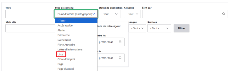 - Pour voir l'ensemble des listes, sélectionner dans type de contenu "Liste" puis cliquer sur le bouton filtrer