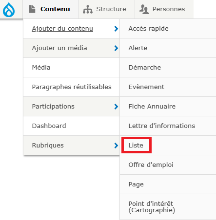 - Cliquer sur Contenu > Ajouter du contenu > Liste