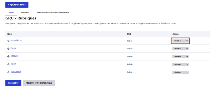 Gérer les rubriques